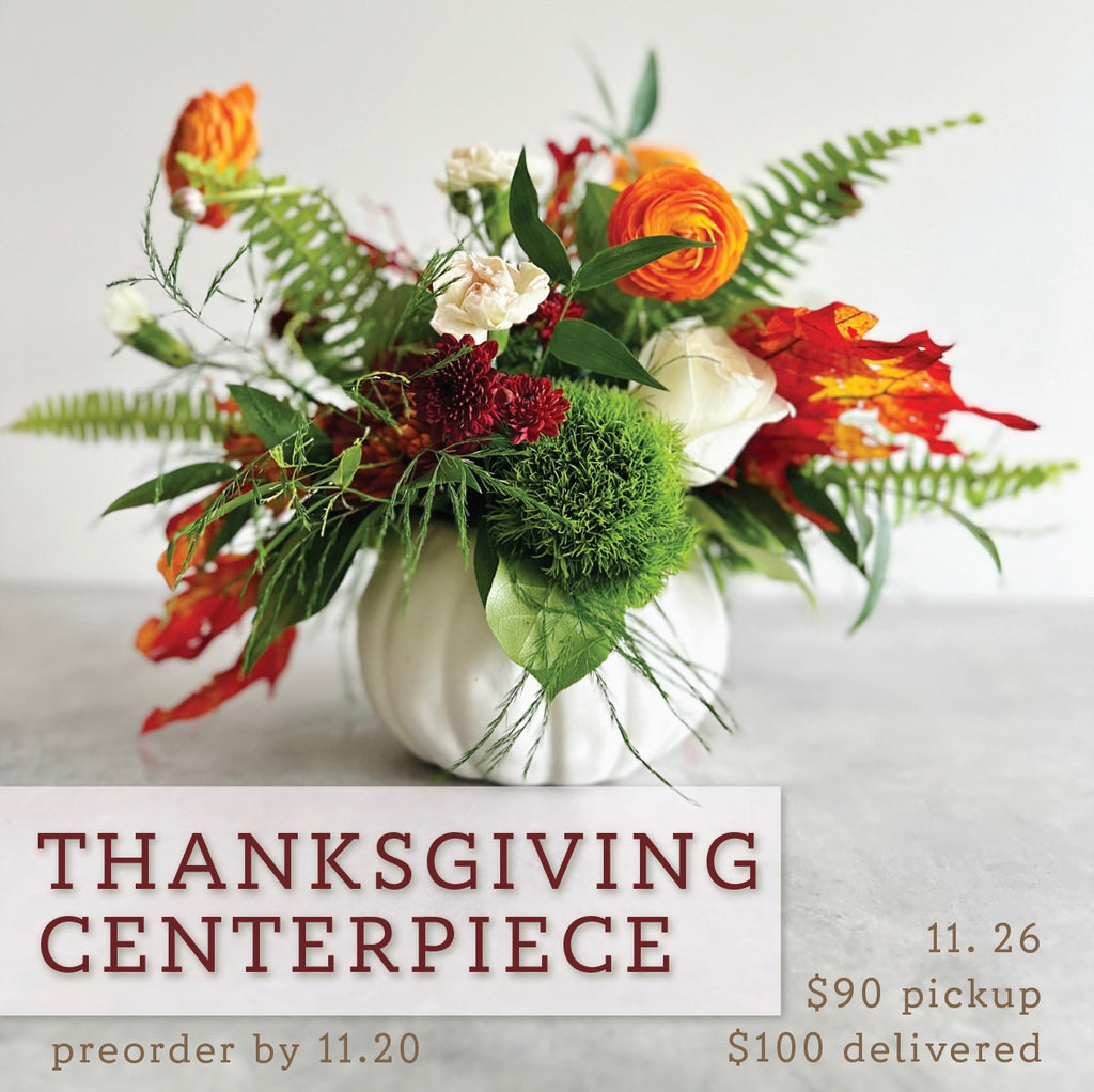 Make your Thanksgiving table unforgettable with our handcrafted centerpiece, beautifully arranged in a white pumpkin vase and filled with seasonal blooms, fall leaves, and rich autumn colors. Perfect for adding a warm, festive touch to your own celebration - or as a thoughtful host gift to bring along to Thanksgiving dinner.